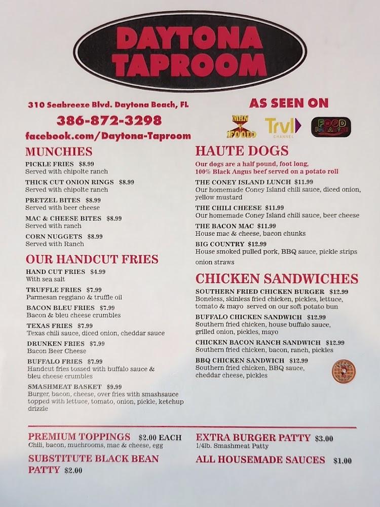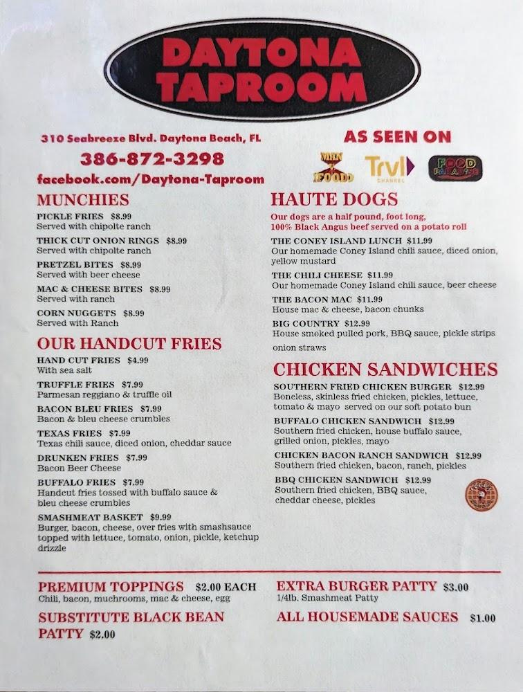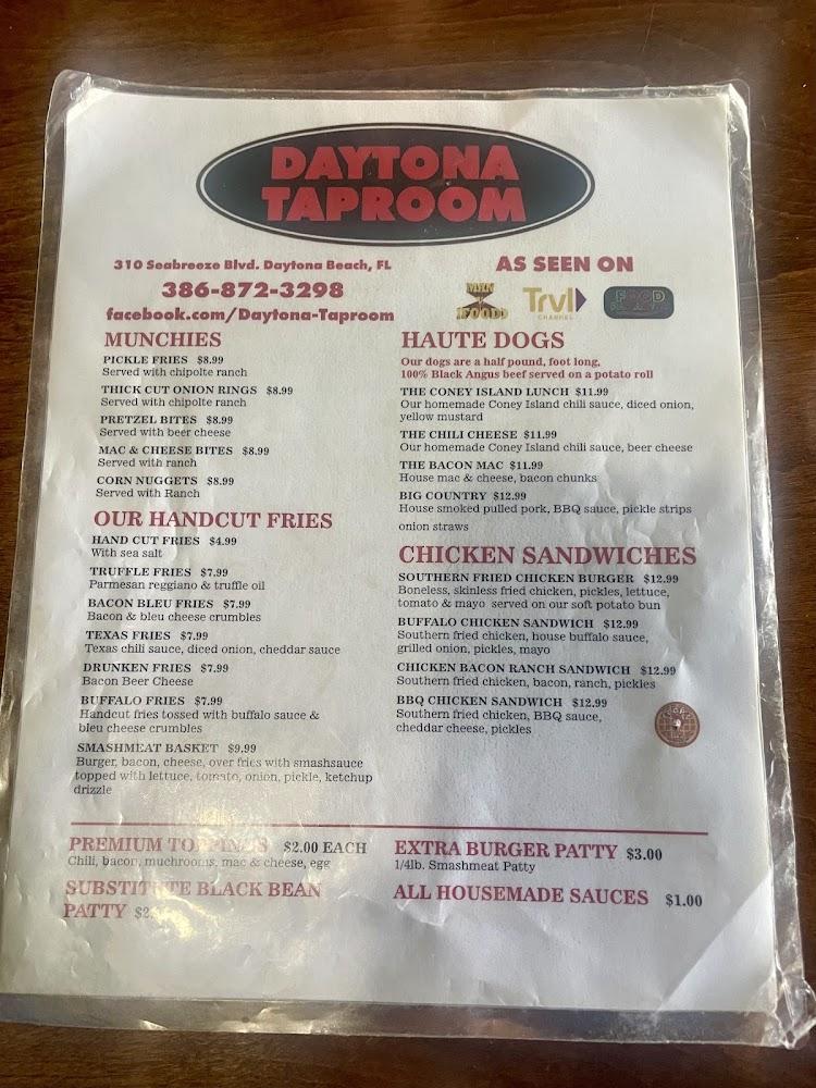 Welcome to Daytona Taproom, your go-to destination in Daytona Beach for an unforgettable dining experience! With 50 beers on tap and a menu featuring the original smashburger, woodfired pizza, and smoked wings from our neighbors at Daytona Pizza and Wings, there's something for everyone. Enjoy a laid-back atmosphere perfect for lunch, dinner, or a solo outing. Our amenities include outdoor seating, delivery, and takeout options, ensuring convenience for all guests. Accessible for everyone, we also host live music and sports, making it the ideal spot to unwind. Join us at 310 Seabreeze Blvd for remarkable tastes and vibrant vibes!